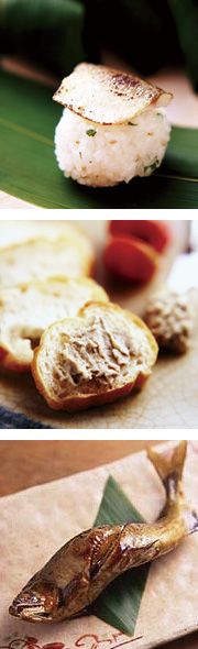 ●前菜拼盤 ●竹葉捲烤香魚壽司 ●香魚粥 ●醬菜・佃煮 ●自家製義式冰淇淋