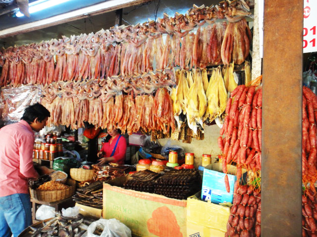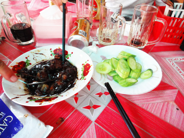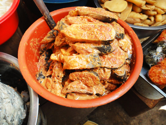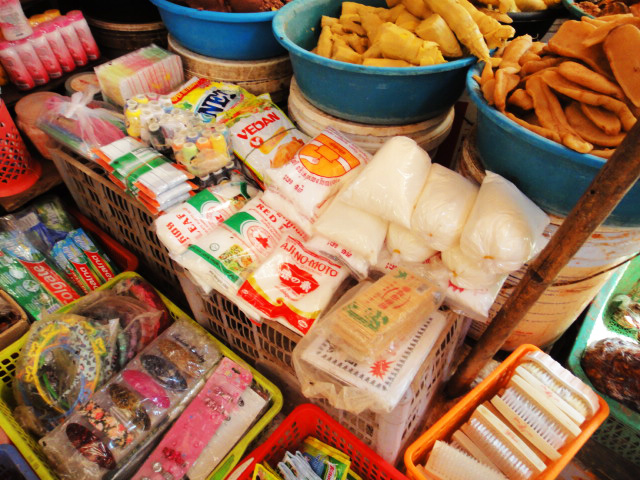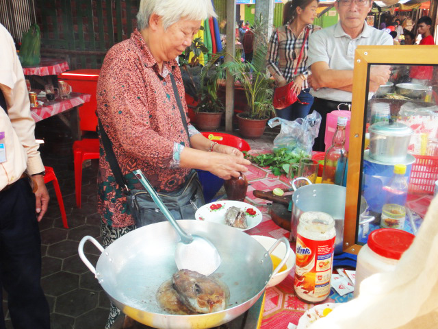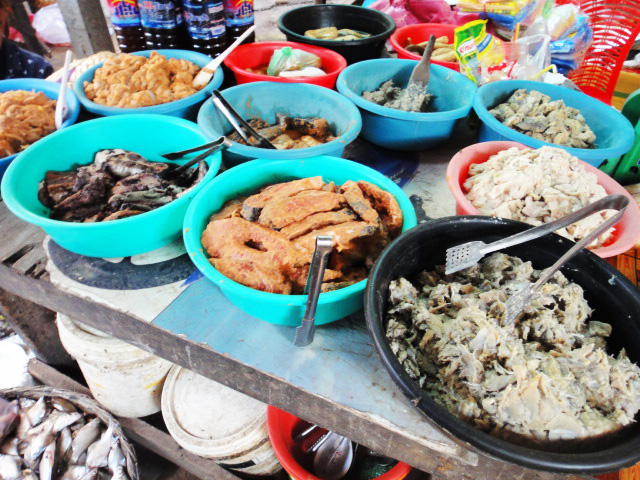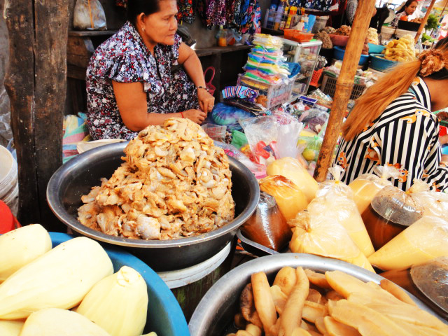 ありとあらゆる食品が、所狭しと売り出されています。市場でプオーク・プラホックを売っていたおばさんに、プオークを現地の食べ方で料理をしてもらうようにお願いしました。焼いたプオークは身をほぐし『調味料として』生野菜と一緒に食べます。甘めの味付け。蒸してスープにしたプオークには香菜がたっぷり。プオークはたくさんの野菜と一緒に、ごはんのおかずとして食べます。