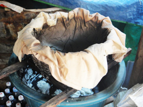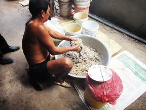 トンレサップ湖の船着き場には、プラホックが山のように積み上げられています。雨季から乾季に移行する時、大量に魚が取れる(12月が一番獲れる)のでとりあえず保存するために塩漬け(プラホック)にするようです。ここまでが一次加工業者(たぶん漁師とその家族)の仕事で、トゥックトレイ作りをする二次加工業者(上半身裸のおじさん)はこれを購入しさらに発酵させて製品を作り上げます。