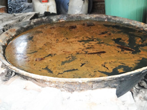 トンレサップ川の流域にある民家へ見学に。3枚におろして身の部分だけを塩漬けした小魚を購入し、それにもう一度塩をし直して発酵させて液体状態に。加熱して濾したものをペットボトルに入れ、市場で販売します。