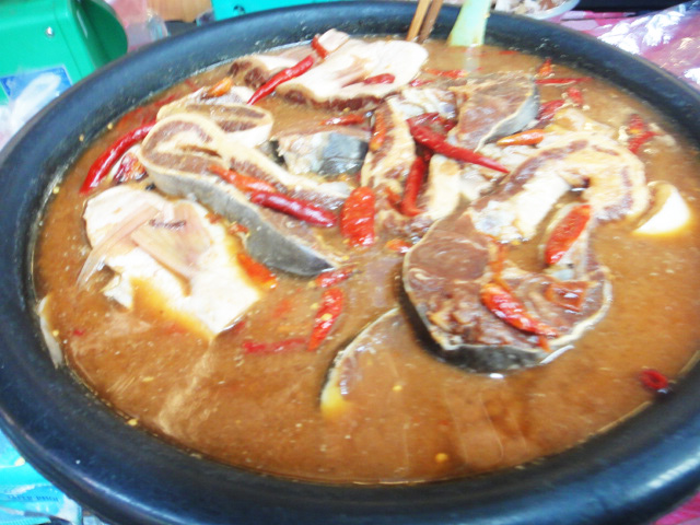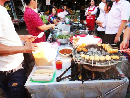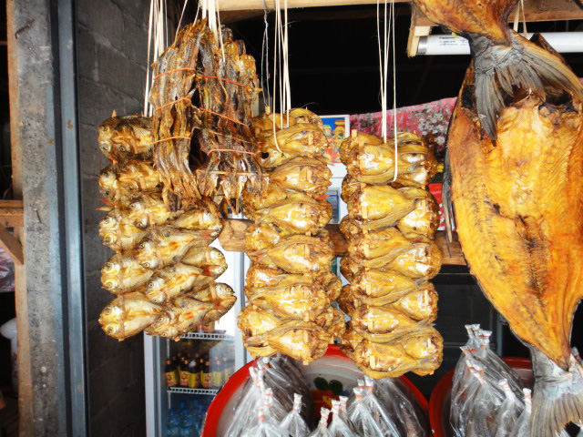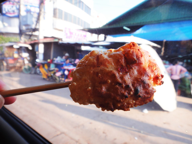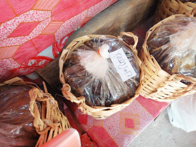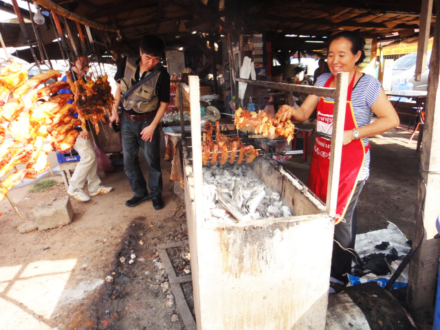 市場入り口で実演販売のBBQ。魚醤(ナンプラー)ベースの甘辛いタレに付け炭火で焼いています。ごはんによく合い、ラオスで一番美味しかったかも。