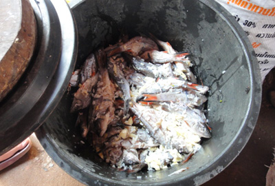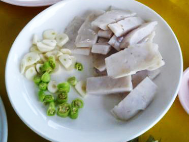 ナレズシと魚醤のホットスポット、メコン川流域のラオス。首都ビエンチェンより北上すること車で約3時間、ナムグム湖畔の沿道に突如と現れた「干物屋」。50軒くらいが軒を連ねていました。2月の気温30℃くらいで常温販売、いつ作ったか不明の干物が売られています。ビニール詰めで籠に入った魚醤、唐辛子入りハンペンのようなもの。このハンペンはナレズシの仲間だということです。付け合わせの"超激辛"生ニンニクと生青唐辛子。これをかじりながら、ハンペンを食べるようですが、日本人にはムリです。ハンペンは少し生臭く感じられます。